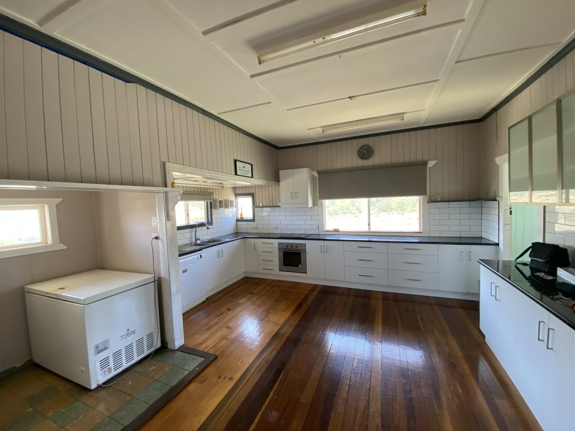 The Classic 3 bedroom Queenslander is a piece of yesteryear, offering hardwood floorboards, tongue and groove walls, high ceilings, bay windows, yet with the addition of a HUGE kitchen blending old country and modern into 1 .... plus there is a sleepout/office and a closed in front veranda out the front....all on adjustable stumps which is always a great thing.